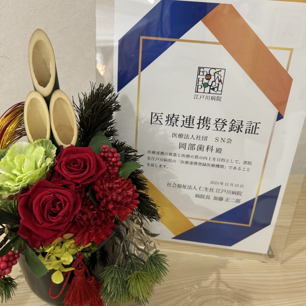 また、岡部歯科は以前から江戸川病院と医療連携しております。術前術後のケアやご入院前、ご入院中お口の中で気になることがございましたら江戸川病院スタッフにお声がけいただくか、岡部歯科へお気軽にご相談ください!